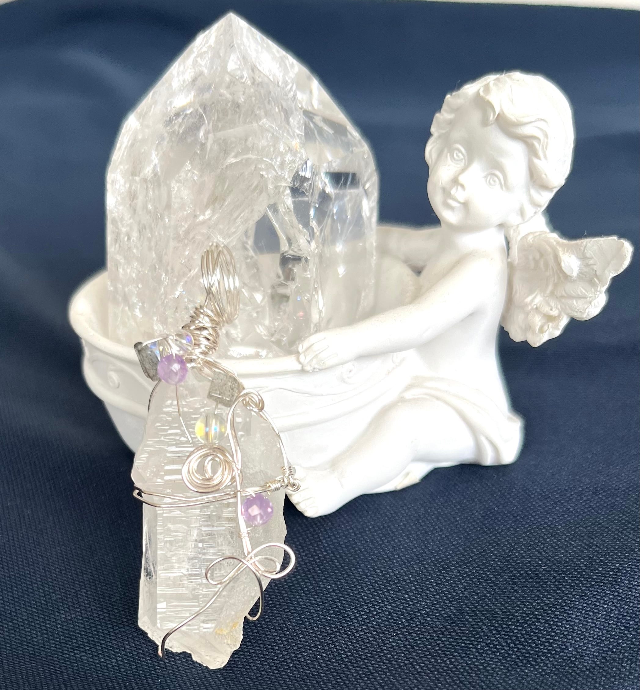 お預かりした水晶をワイヤーデザインしました。デザインのアクセントに3ミリ玉のアメジストとアイリスクウォーツ、四角のシラーがキレイなラブラドライトを所々に入れ込みました。