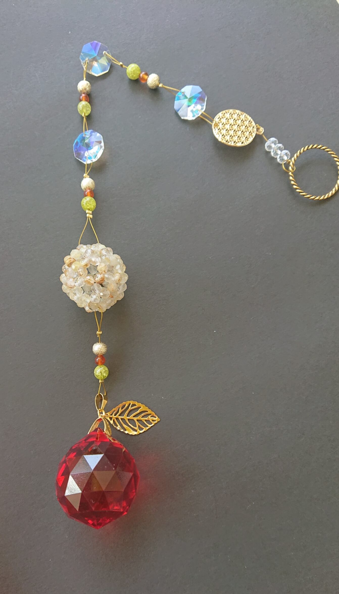 バッキーボール(フラーレン)と天然石を入れ、サンキャッチャーに組み合わせました。