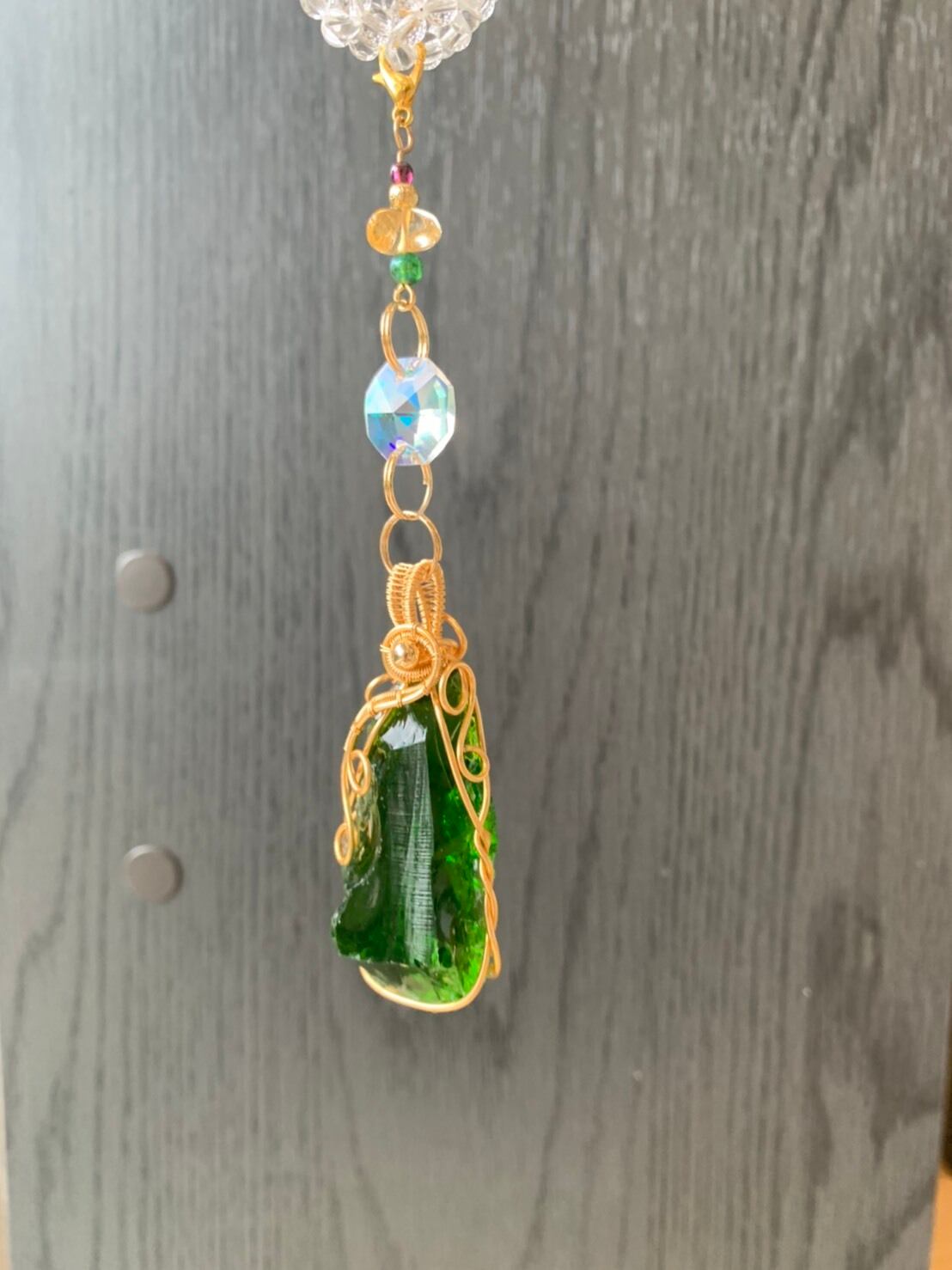 バッキーボール(フラーレン)と天然石を入れ、サンキャッチャーに組み合わせました。